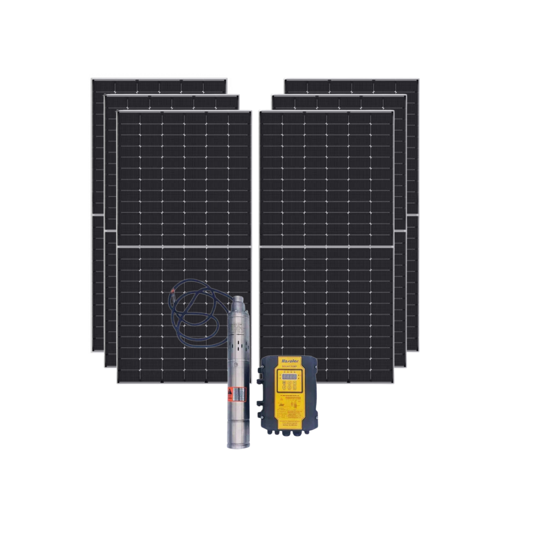 HZ Solar AC/DC Submersible Pump 155m + 6x 420W Tier 1 Solar Panels – 9.2m³/h / 155m Head / Off-Grid Water Solution All-in-One Solar Water Pumping Solution This HZ Solar Submersible Pump Combo delivers high flow and efficiency for deep wells and boreholes, powered by 6 x 420W Tier 1 solar panels . Built for farms, rural homes, and off-grid communities, the system provides a max flow rate of 9,200 L/h with a pumping depth of up to 155 m . ONLINE ONLY - PRE ARRANGE FOR IN STORE COLLECTION Dual Power Input – AC/DC Operation This model can run on both solar panels (DC) and mains/grid power (AC), giving you flexibility and reliable performance all year round. Use solar power during the day to save on energy costs, and switch to AC when sunlight is insufficient. DC Input : Do not exceed 450V / 12A . AC Input : Do not exceed 240V . Operates directly from solar panels during the day to reduce energy costs. Switches to grid power when solar energy is insufficient, ensuring uninterrupted performance . Pump Specifications Model: 4SPB6.8-155-AC/DC-2400 Max flow: 9.2 m³/h (9,200 L/h) Max head (depth): 155 m (recommended ≤110m) Rugged submersible design for continuous operation Flexible string wiring: Series – voltage summed, current constant Parallel – voltage constant, current summed DC don't exceed 450V and 12A AC don't exceed 240V Solar Panel Specifications 6 × 420W Monocrystalline Tier 1 panels Efficiency: High-output Tier 1 bankable modules Per panel rating: 38.9V / 9.26A Applications Agricultural irrigation & crop watering Livestock water supply Rural community water projects Off-grid homes, lodges, and smallholdings Combo Includes : 6x 420W Mono Crystal Solar Panels 1x HZ Solar Wate Pump 155m AC/DC PLEASE NOTE THAT SOLAR PANELS ARE COURIERED AT OWN RISK !! IF DAMAGES OCCURE WE WON'T BE HELD RESPONSIBLE Why This Combo? Complete package: Pump + solar panels = ready-to-install Energy savings with solar-powered pumping AC/DC flexibility with built-in protections